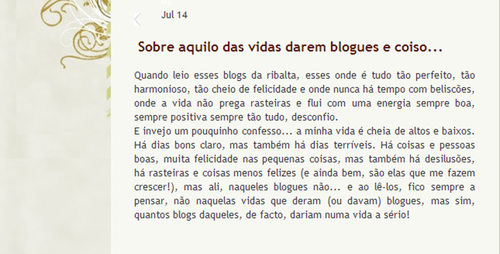 Entrei neste blog, http://angelasoeiro.blogs.sapo.pt/, mais precisamente neste post por causa dos destaques do sapo! E aquilo que a autora escreve neste post é tão verdadeiro... gostei! Em alguns blogs e em alguns perfis nas redes sociais parece que a vida corre bem a toda a gente, é fotos de viagens, de férias, é jantares com os amigos, é anúncios de casamentos, palavras bonitas e positivas, uma vida cheia de altos que provavelmente esconde os baixos. Sim, porque momentos baixos infelizmente toda a gente tem, é verdade que uns mais que outros!