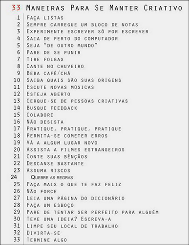Estas dicas correm as redes sociais e a blogosfera há já algum tempo. Da minha parte, há mais de dois anos que faziam parte do ambiente de trabalho do meu computador. Mais que regras para procurar a criativa, são lições de vida que a tornam mais simples e feliz!